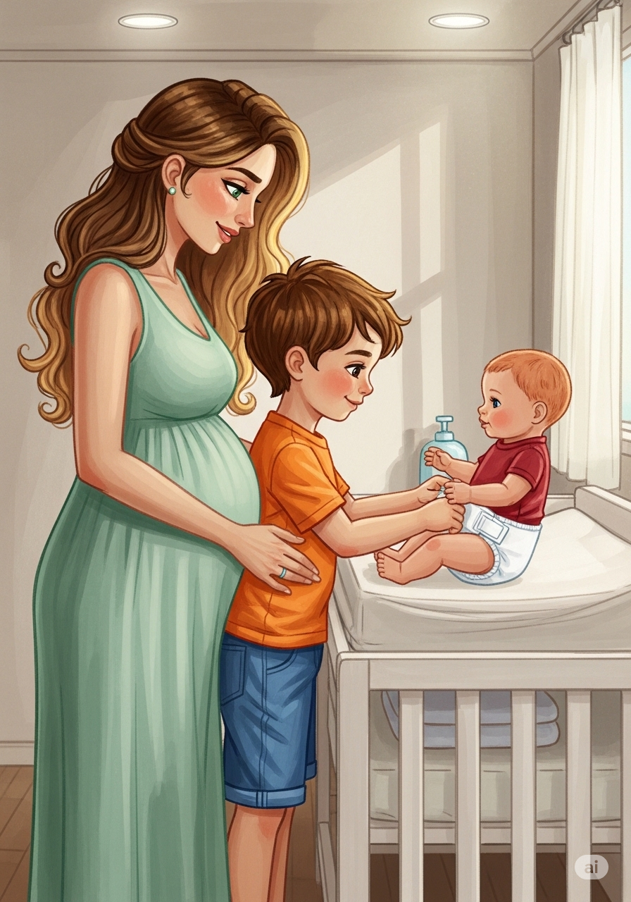 אמא הראתה לאיתי איך מחליפים חיתול. איתי עזר לה לסגור את המדבקות של החיתול של גיל בזהירות, ממש כמו שאמא עושה. "אתה עושה עבודה נפלאה, איתי," אמרה אמא בגאווה. "התינוק החדש יהיה כל כך בר מזל שיש לו אח גדול כמוך." איתי הרגיש בלב תחושה של גאווה ושמחה.