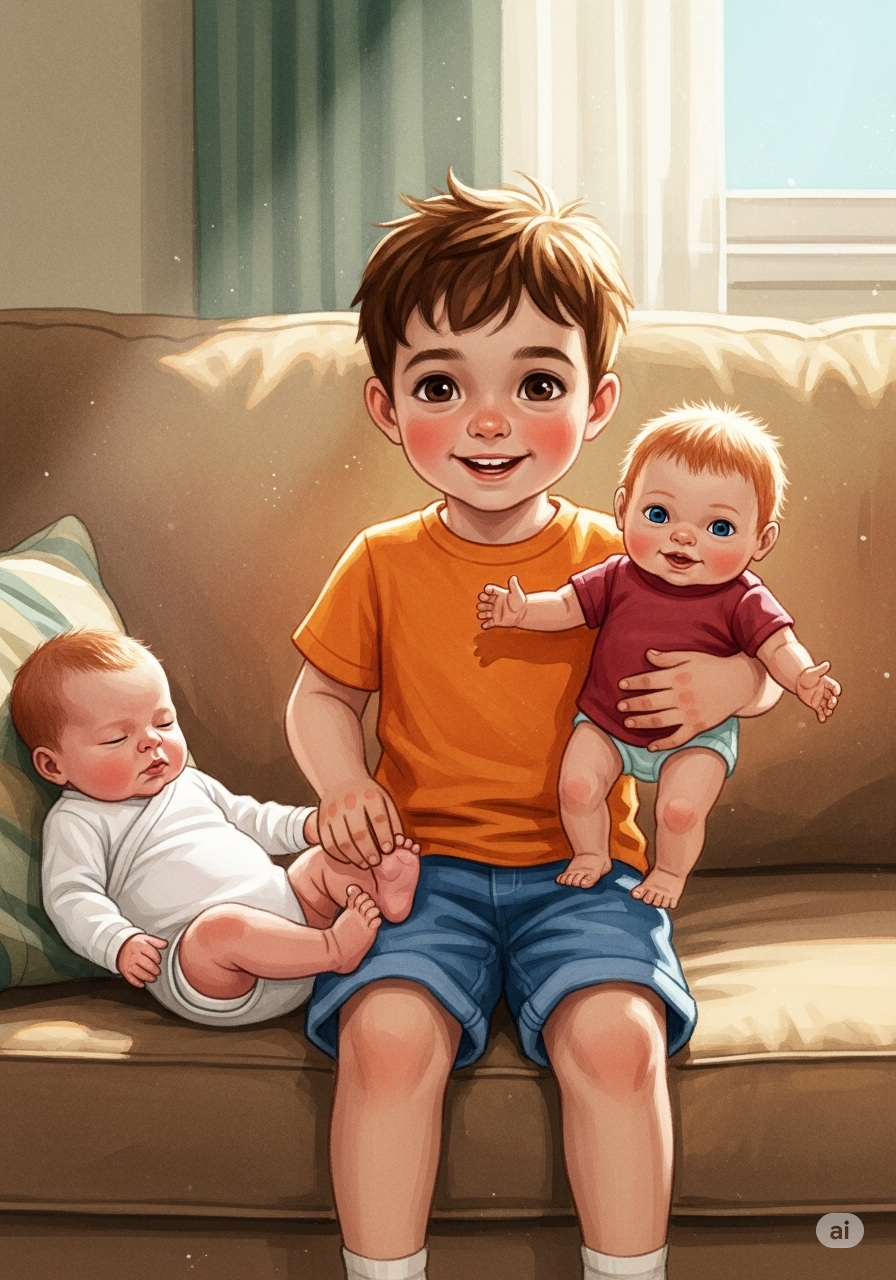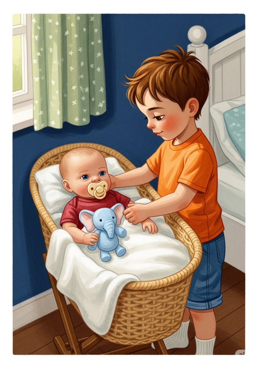 כשהגיע זמן שנת הצהריים, איתי השכיב את גיל במיטה הקטנה שלו. הוא הניח לידו את הפיל הכחול ונתן לו נשיקה על המצח. "לילה טוב, גיל הגאון שלי," הוא אמר. איתי הבין שתינוקות צריכים המון אהבה ושקט, והוא ידע שהוא יוכל לתת את זה גם לאחיו האמיתי.