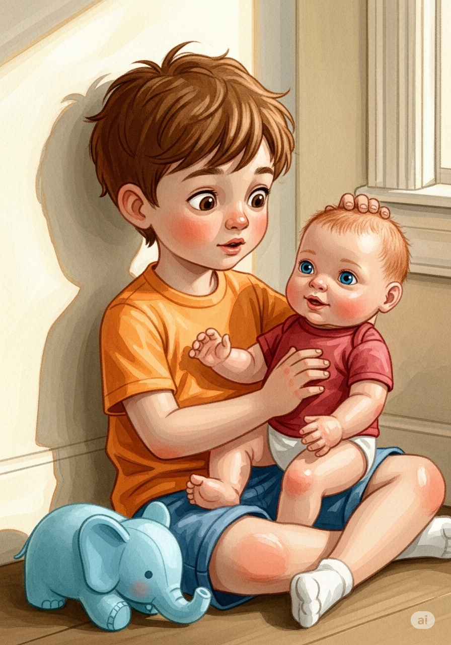 איתי הרים את גיל וחיבק אותו חזק. גיל הרגיש בדיוק כמו תינוק אמיתי בזרועותיו. איתי לקח את הפיל הכחול והצמיד אותו לגיל. "אל תדאג, גיל," הוא לחש, "אני אשמור עליך ואלמד אותך הכל. אני האח הגדול שלך." אמא עמדה בצד וחייכה, היא ראתה כמה איתי עדין ואוהב.