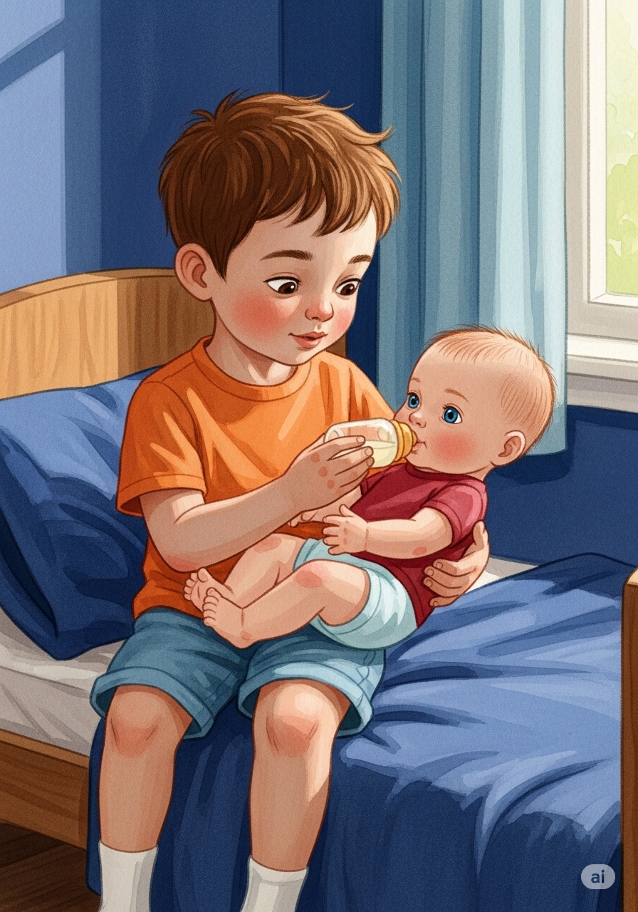 בכל יום, איתי התאמן בטיפול בגיל. הוא הושיב אותו על הכרית והביא לו בקבוק קטן. "הנה, גיל, זמן לאכול," הוא אמר בנחת. הוא הקפיד להחזיק את גיל בצורה נכונה, בדיוק כפי שאמא הסבירה לו. איתי הרגיש שהוא הופך למומחה אמיתי לתינוקות.